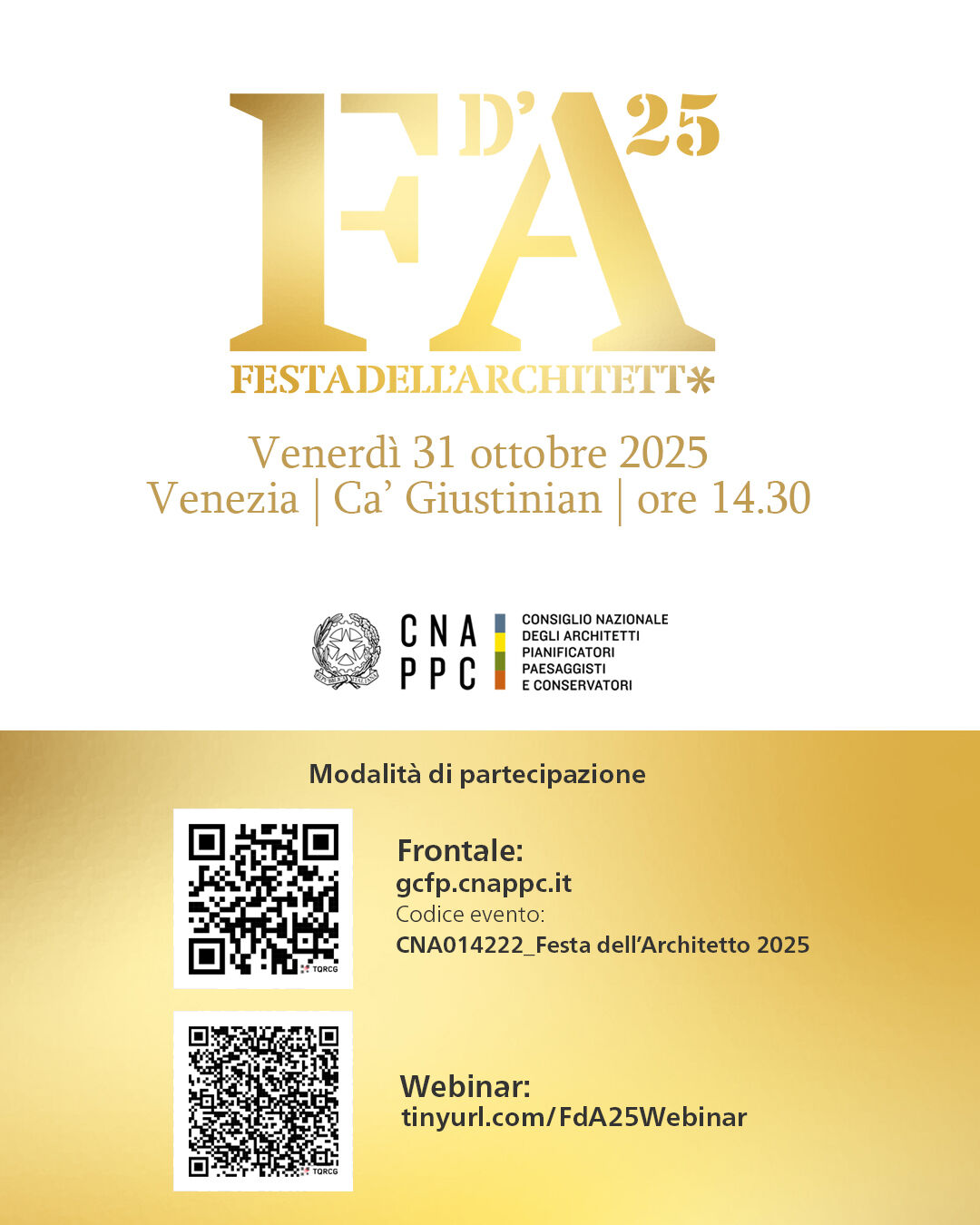 I professionisti iscritti agli Ordini di categoria che intendono partecipare in modalità webinar devono iscriversi all’evento alla pagina web: https://tinyurl.com/FdA25Webinar